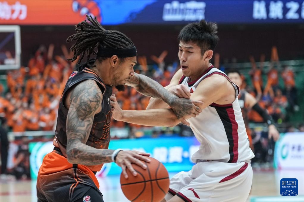 3月16日,山东高速队球员珀塞尔(左)在比赛中突破。