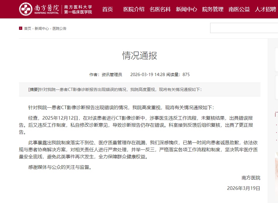 针对“患者CT影像诊断报告出现错误”一事,南方医科大学南方医院19日发布情况通报。