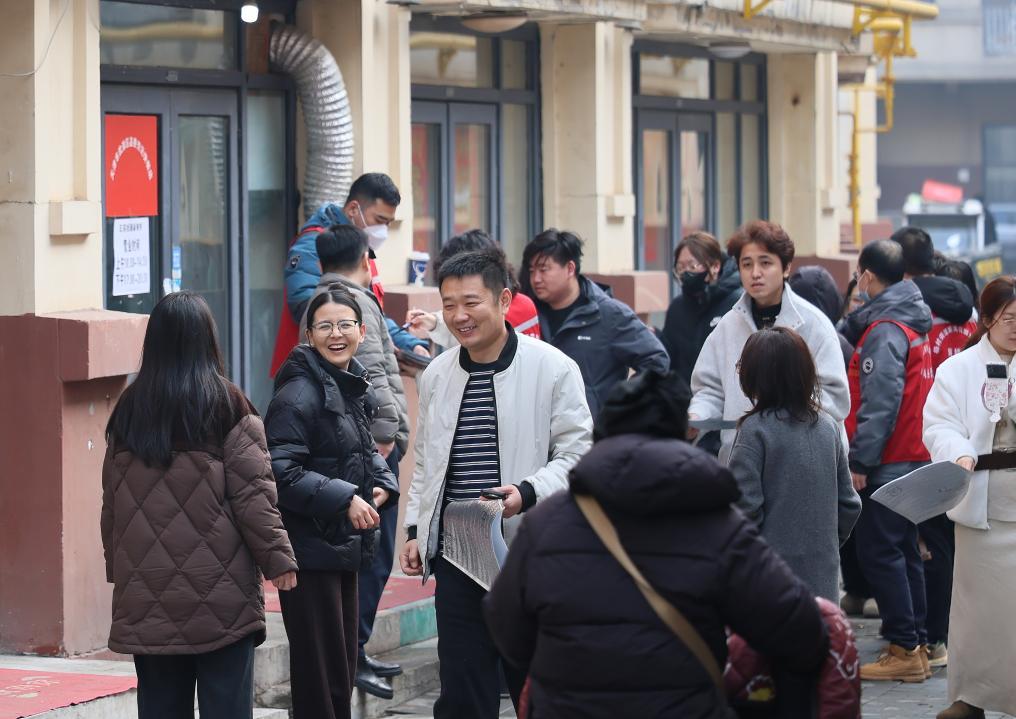在天津市武清区杨村街道赵磊的小店门前,排到号的顾客喜笑颜开(3月3日摄)。新华社记者 李然 摄