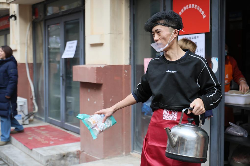 赵磊拎着水壶准备给等候的顾客倒水(3月3日摄)。新华社记者 李然 摄