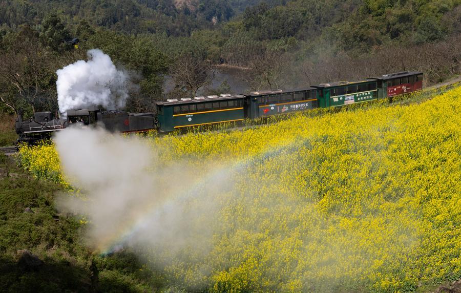 在四川省乐山市犍为县芭沟镇,小火车行驶在油菜花田中(3月4日摄)。新华社发(陈大康摄)