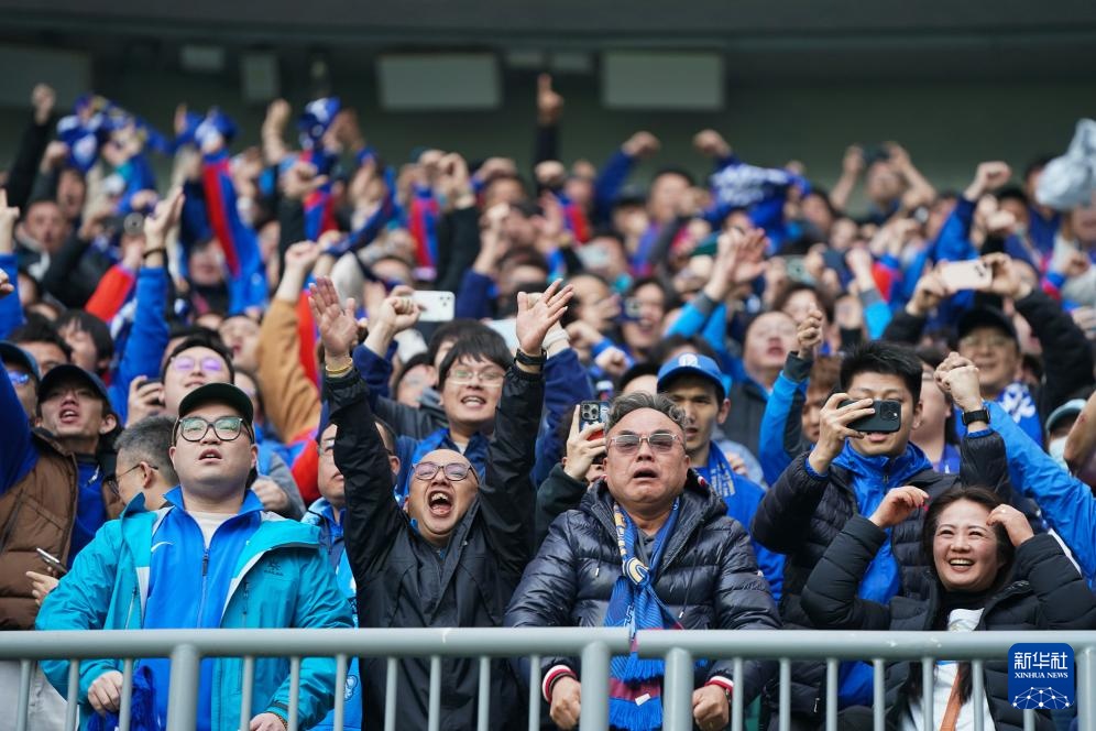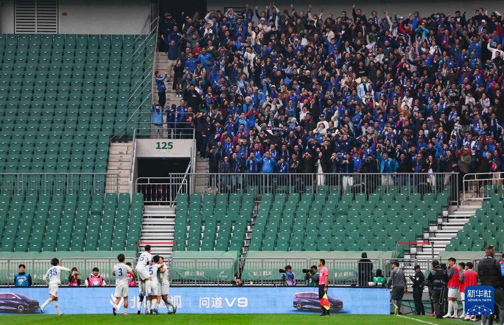 3月21日,上海申花队球迷庆祝球队进球。