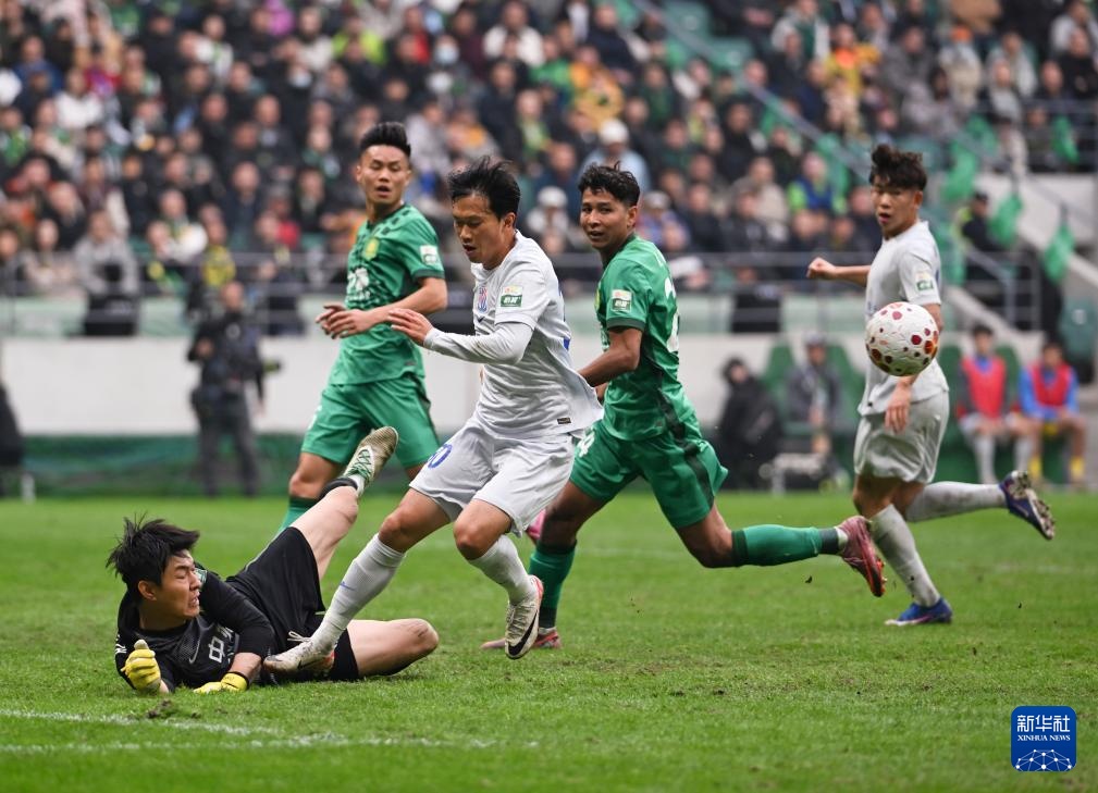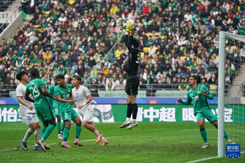 3月21日,北京国安队门将张健智(上左)在比赛中扑救。