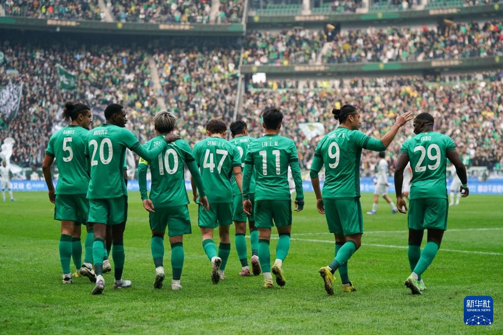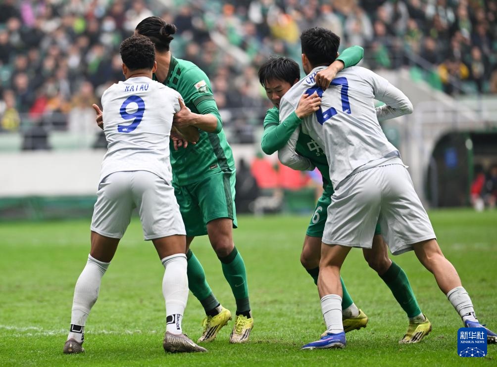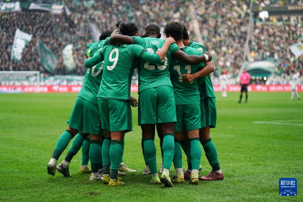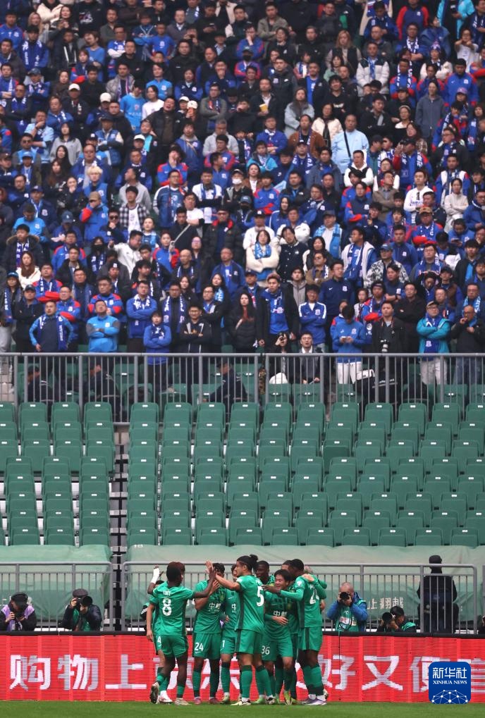 3月21日,北京国安队球员在比赛中庆祝进球。