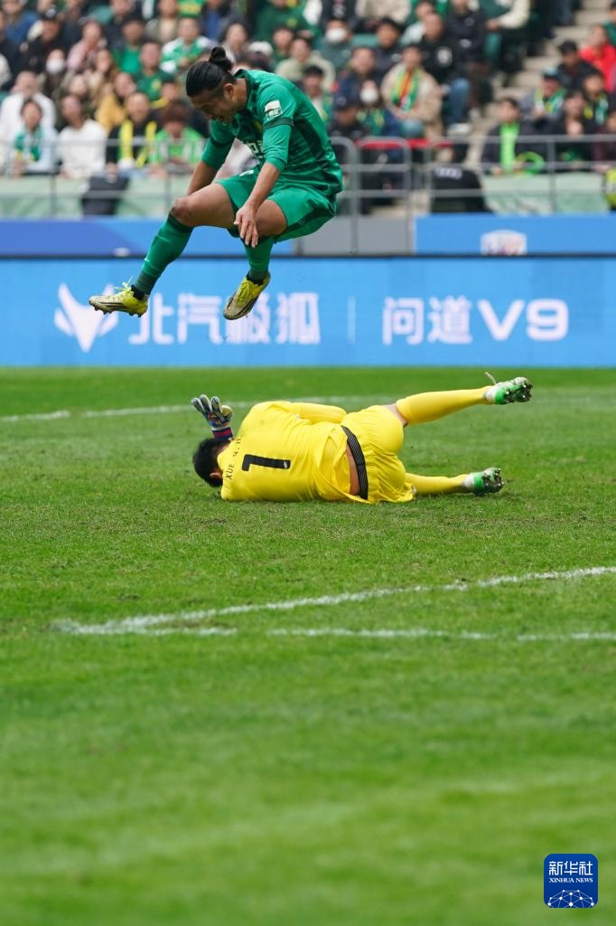3月21日,北京国安队门将张健智(上)在比赛中扑救。