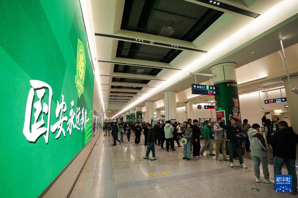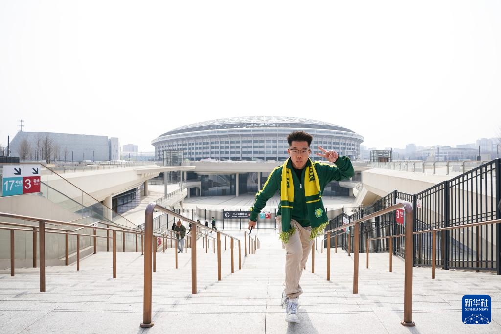 3月21日,一名北京国安球迷赛前从北京地铁3号线工人体育场站出站。