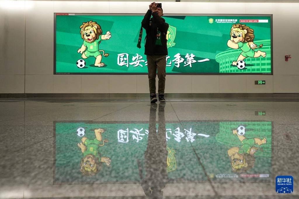 3月21日,一名北京国安球迷赛前在北京地铁3号线工人体育场站拍照留念。