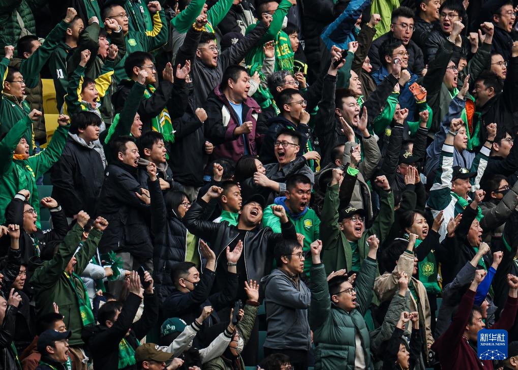 3月21日,北京国安队球迷庆祝球队进球。