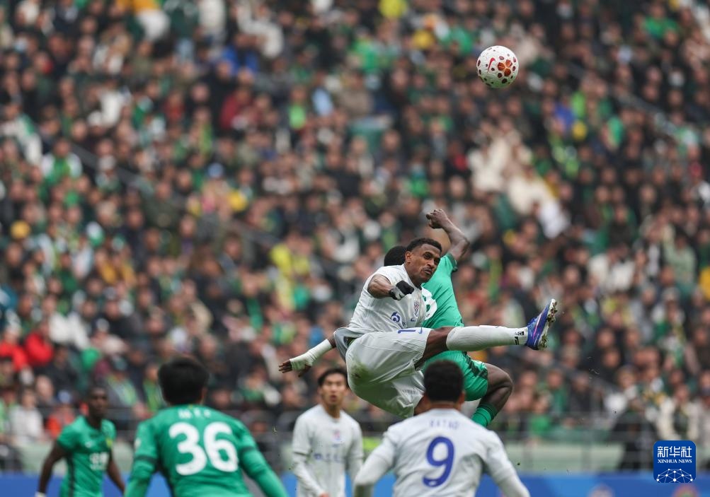 3月21日,北京国安队球员在比赛中防守任意球。