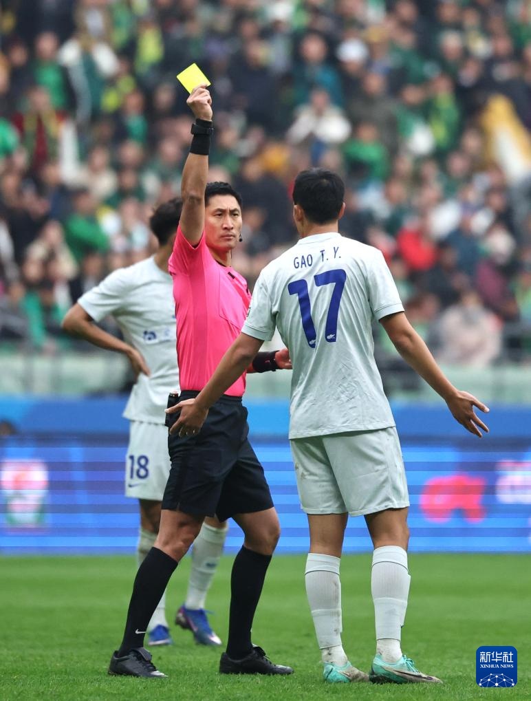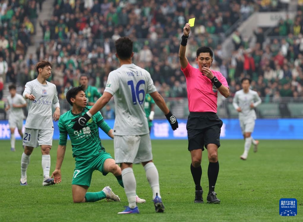3月21日,主裁判马宁(右)向上海申花队球员杨泽翔(中)出示黄牌。