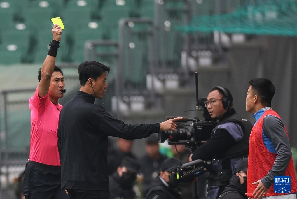 3月21日,主裁判马宁(左一)向替补席上的上海申花队球员王世龙(右一)出示黄牌。