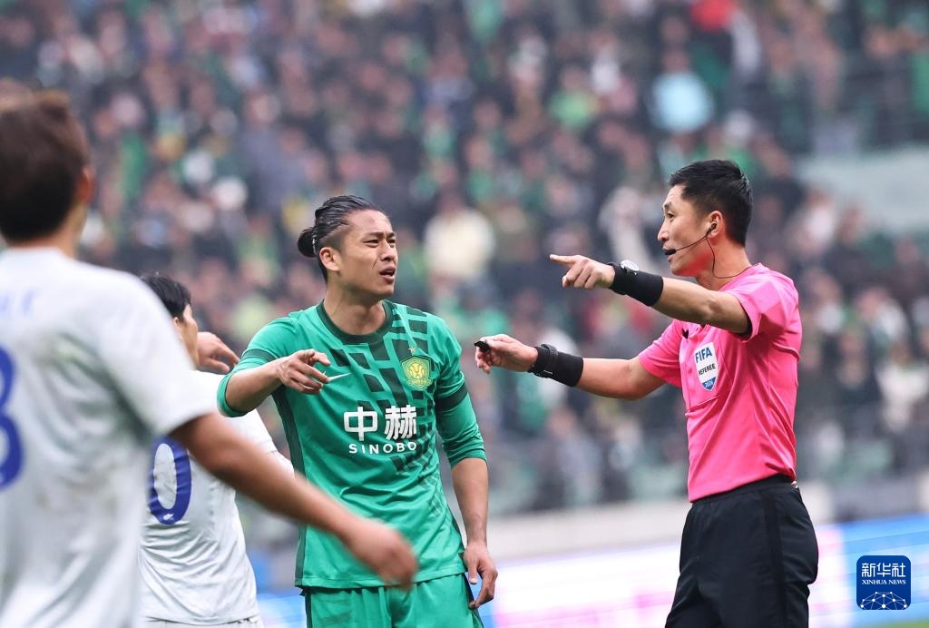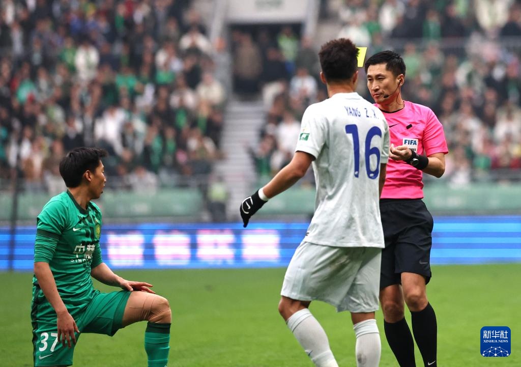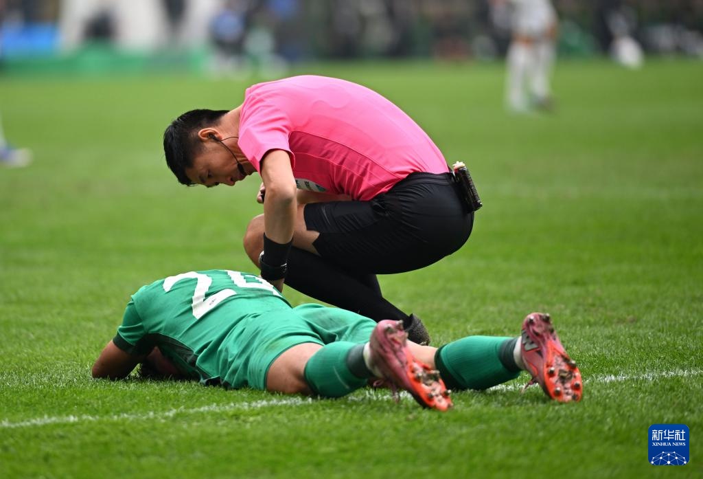 3月21日,主裁判马宁(上)在比赛中查看倒地的北京国安队球员阿不都海米提·阿不都格尼。
