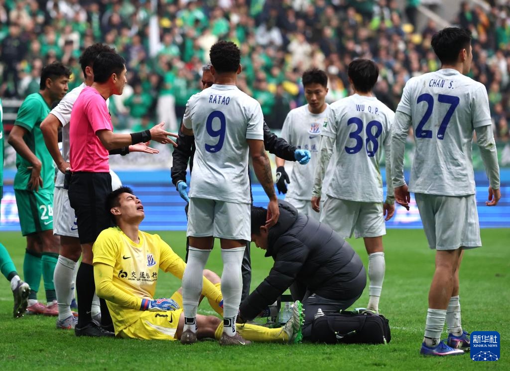 3月21日,上海申花队守门员薛庆浩(下左)在比赛中受伤。