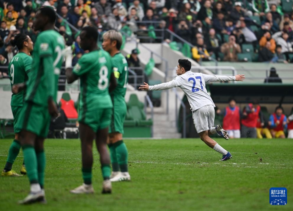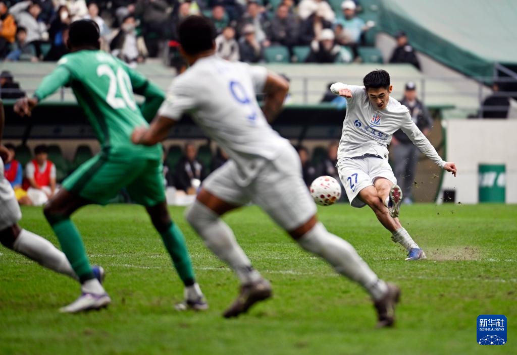 3月21日,上海申花队球员陈晋一(右)任意球破门得分。