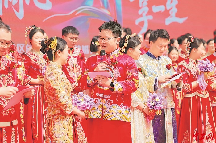 4月12日,正值泡桐花浪漫绽放之际,以“AI享一生”为主题的北京经开区职工集体婚礼、北汽新能源第五届青年集体婚礼在博大公园举办。28对新人身着中式婚服携手登场,在烂漫花海中许下爱的誓言。本报记者 赖志凯 本报通讯员 何欣 摄