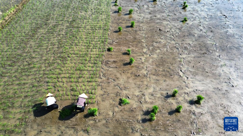 4月25日,在江西省九江市都昌县土塘镇潭湖村,农民在田间栽插早稻。
