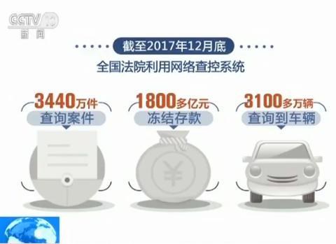 截至2017年12月底,全国法院利用网络查控系统共查询案件3440万件、冻结存款1800多亿元,查询到车辆3100多万辆、证券522亿余股、互联网银行存款超32亿元。全国累计公开失信被执行人信息959万余人次,限制高消费78万例,限制购买飞机票936万人次、高铁动车票367万人次。