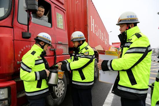 为缓解司机师傅的焦虑心情,宁通支队执法人员将烧好的开水和方便送到大家手中,并动之以情、晓之以理地做好宣传解释工作。