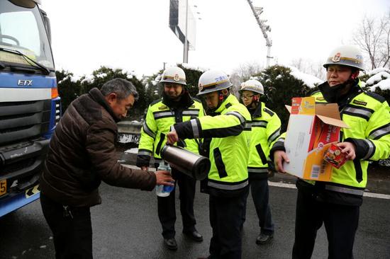 原来,这是江苏省高速公路交通运输执法总队宁通支队执法人员在给大家“雪中送炭”!