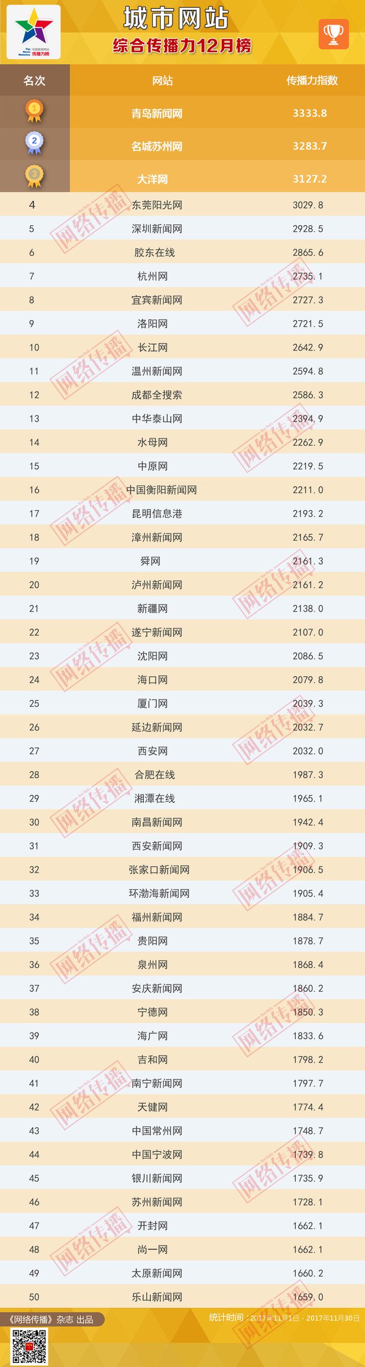 中央网信办《网络传播》杂志倾力打造的“城市网站传播力2017年12月榜”今日发布。
