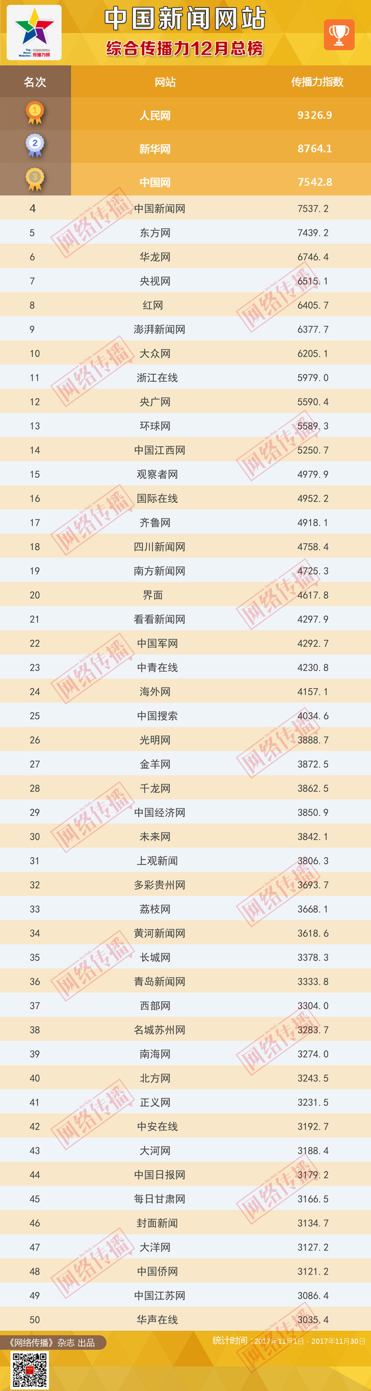 中央网信办《网络传播》杂志倾力打造的“中国新闻网站传播力2017年12月总榜”今日发布。
