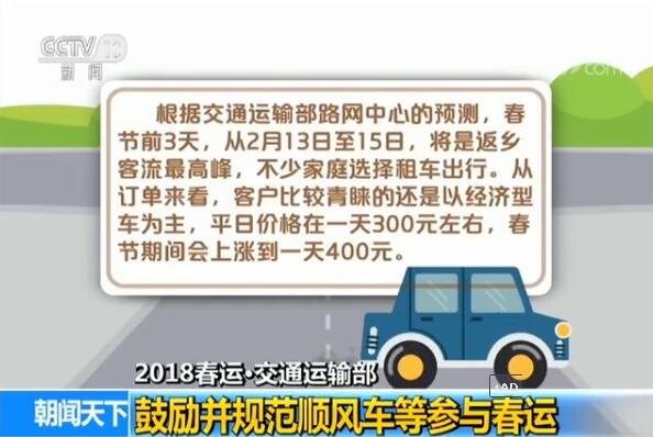 根据交通运输部路网中心的预测,春节前3天,从2月13日至15日,将是返乡客流最高峰,不少家庭选择租车出行。从订单来看,客户比较青睐的还是以经济型车为主,平日价格在一天300元左右,春节期间会上涨到一天400元。和以往300公里以内的短距离租车相比,今年的租车市场开始出现一些中长距离订单,而为了降低用车成本,一些客户还会选择合租。