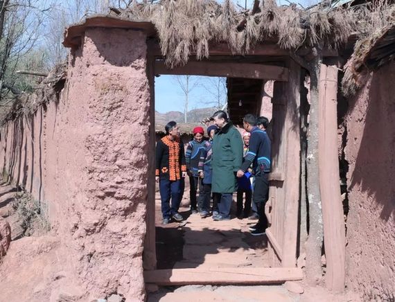 习近平总书记步行走进村子,沿着一段上坡路,深一脚浅一脚地来到一户人家。