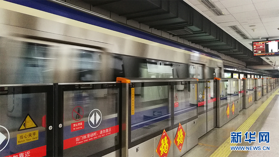 2018年2月15日,北京地铁2号线屏蔽门上都贴上了“福”字,喜迎农历新年。新华网 张明宇 摄