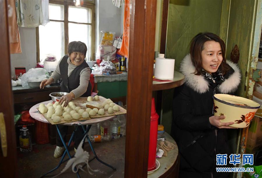 2月13日,沈阳市铁西区工人村的刘惠明(左)与邻居一同制作豆沙包。新华社发