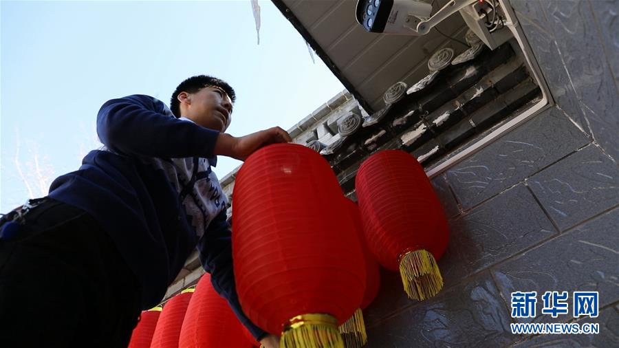 陕西省延安市梁家河返乡创业青年梁强正在农家乐挂灯笼(2月5日)。新华社记者 李华 摄