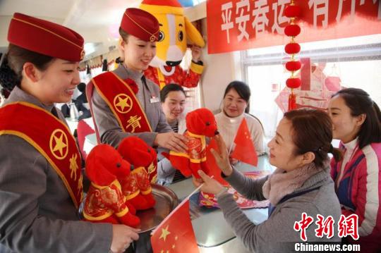 图为列车工作人员把祝福送给乘客。 张强 摄
