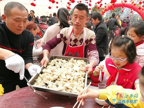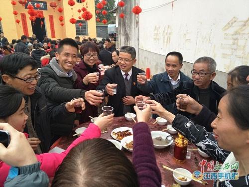 记者在现场看到,党的十九大代表、芦溪县源南学校党总支书记龚德凌来到了现场,陪伴农民朋友同吃过年团圆饭,与村民们共话2018年中央一号文件对农村、农业、农民带来的好处。