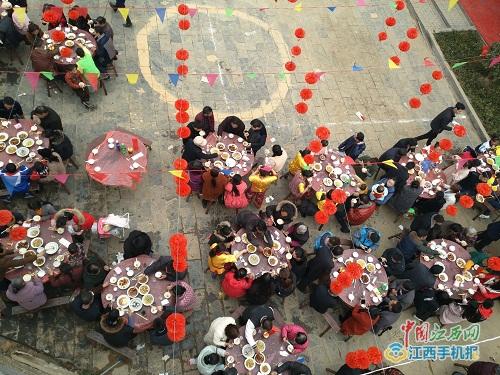 中国江西网萍乡讯记者万炳全报道:“唱支山歌给党听,我把党来比母亲;母亲只生了我的身,党的光辉照我心......”2月15日(除夕日)上午,江西萍乡市芦溪县芦溪镇东阳村樟树下自然村正在建设中的村史馆(丹桂祠)门前年味浓,大红灯笼高高挂,载歌载舞迎新年,缩龙起舞展民俗......该自然村13个姓氏的350多名村民集体在这里过大年,同吃团圆饭,一首《唱支山歌给党听》引发全体村民热烈掌声。