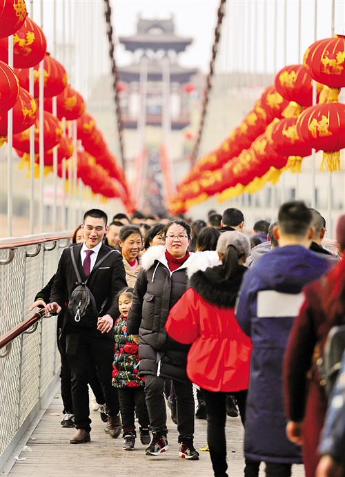 2月18日,四川南充市嘉陵区天乐谷景区孝心桥,游客参加踩桥民俗游。春节期间,民俗旅游成为春节旅游消费主角。 张智勇摄