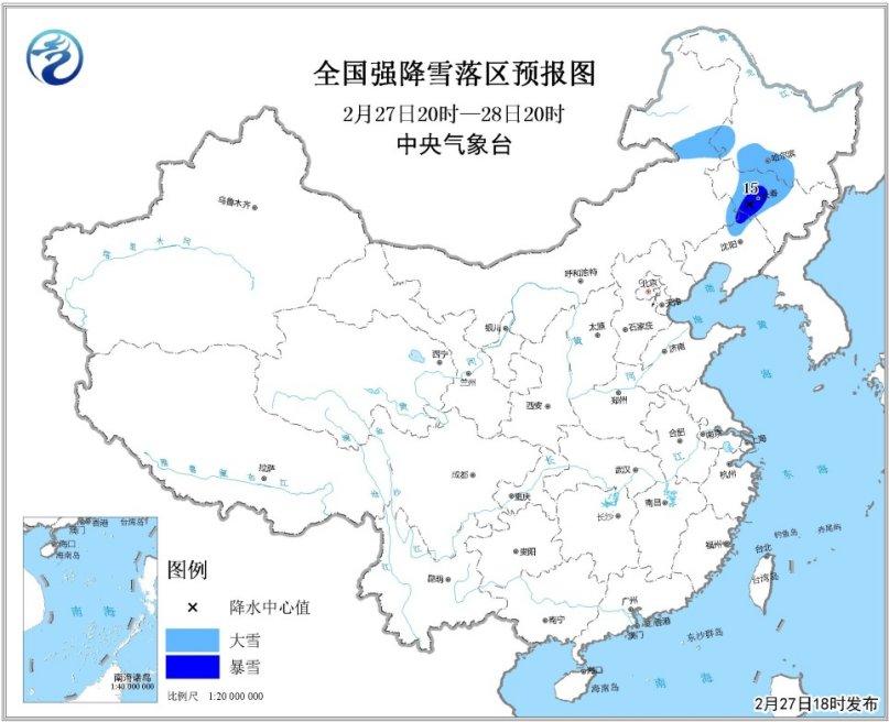 27日20时至28日20时,内蒙古东北部、黑龙江西南部、吉林中部和辽宁北部等地的部分地区有大雪,其中,吉林中部局地有暴雪(10~15毫米);上述地区新增积雪深度4~7厘米,局地可达10厘米左右(见图1)。中央气象台2月27日18时发布暴雪蓝色预警。