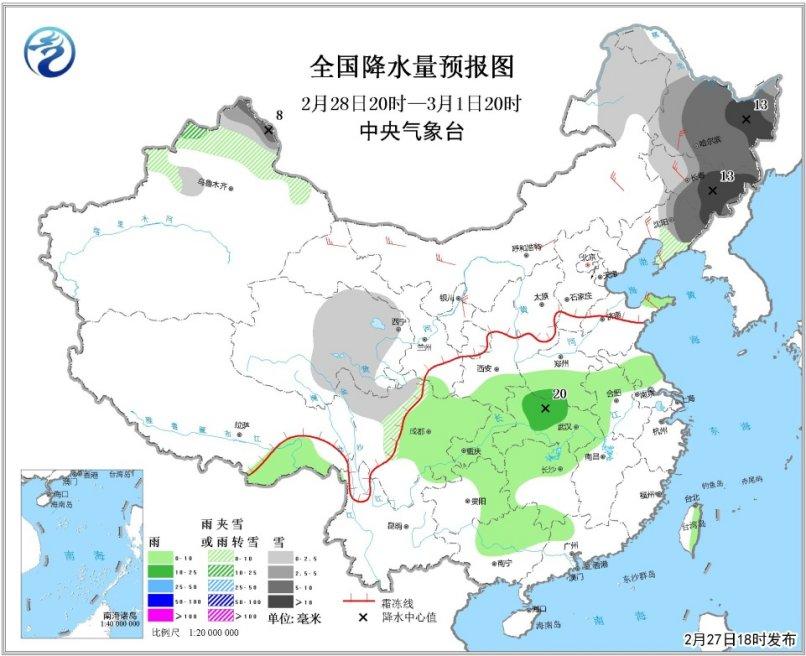 图2 全国降水量预报图(2月27日20时-2月28日20时)