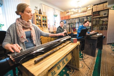 2014年9月,龙凤琴社正式成立,成为中国音乐在俄罗斯的窗口。图为俄罗斯莫斯科龙凤琴社的师生琴箫合奏(2017年5月13日摄)。 新华社记者 吴 壮摄
