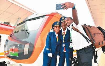 2017年5月31日,由中国企业承建的蒙内铁路正式建成通车。图为在肯尼亚蒙巴萨的蒙内铁路蒙巴萨西站,一名肯尼亚记者和火车司机肯西莉亚(中)、艾丽斯合影留念。 新华社记者 孙瑞博摄