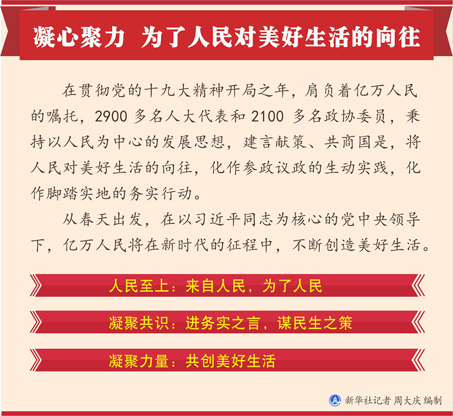在贯彻党的十九大精神开局之年,肩负着亿万人民的嘱托,2900多名人大代表和2100多名政协委员,秉持以人民为中心的发展思想,建言献策、共商国是,将人民对美好生活的向往,化作参政议政的生动实践,化作脚踏实地的务实行动。