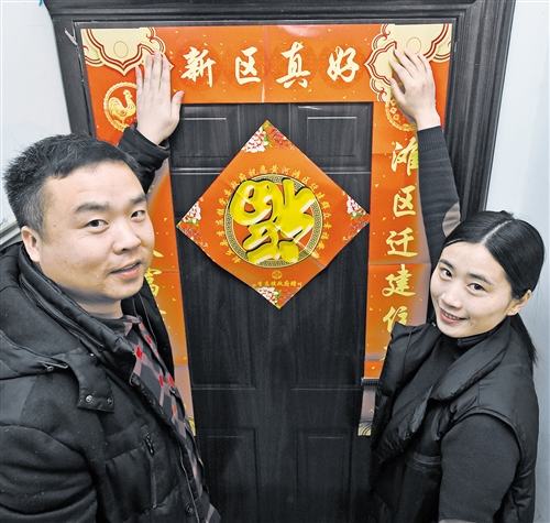 2月15日,在河南省封丘县李庄新区,搬迁户田书新(右)和丈夫在贴春联。2017年8月,国家发改委批复《黄河滩区居民迁建规划》,一场涉及百万人的大迁建开始实施。李嘉南摄(新华社发)