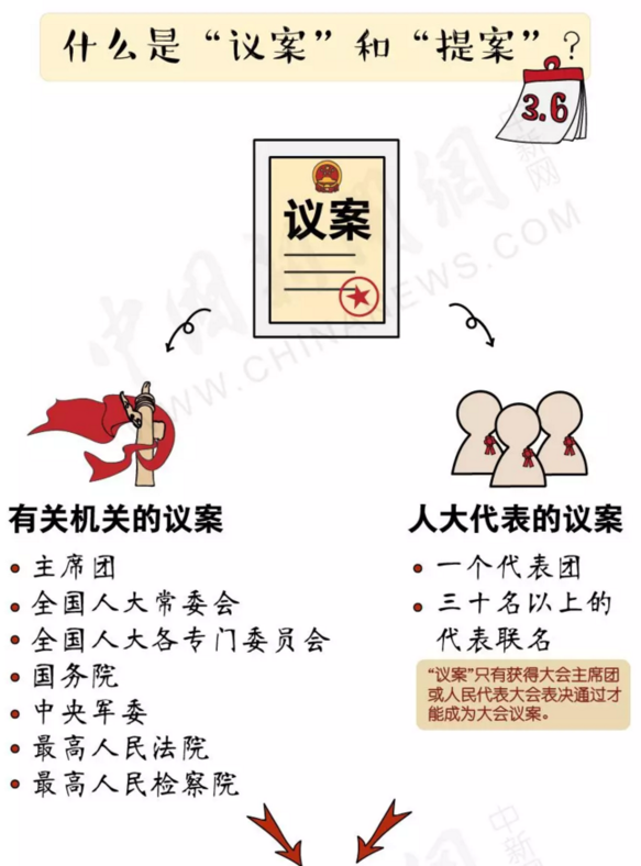 “议案”是人大的专门术语之一,是指由法定机关和法定人员依照法定程序提请本级人民代表大会或人大常委会会议进行审议,并要求人大会议讨论、作出决定的议事原案;