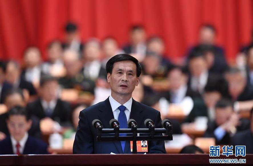 3月8日,全国政协十三届一次会议在北京人民大会堂举行第二次全体会议。这是胡曙光委员作《长江大保护亟待推行“硬约束”》的发言。新华社记者 张领 摄