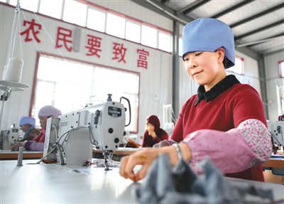 宁夏吴忠市同心县河西镇旱天岭村村民在村里的“扶贫车间”参加服装加工技能培训(2017年12月21日摄)。这座新落成的“扶贫车间”可解决本村上百名建档立卡贫困妇女的就业问题。
