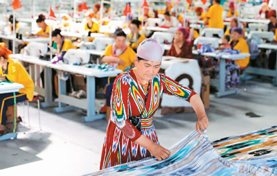 新疆喀什市乃则尔巴格镇的海仁古丽·居玛在镇上妇女创业脱贫基地的缝纫企业里裁剪布料(二〇一七年六月三十日摄)。在广东援疆资金支持建设下,乃则尔巴格镇逐步成为更宜居宜业的美好家园。
