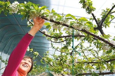 山东荣成市近年大力发展高效农业和生态扶贫产业项目,全市大樱桃种植发展上千亩。3月7日,在荣成市石岛管理区产业扶贫项目龙山湖生态采摘园一家樱桃大棚里,果农正在给樱桃树压枝疏花,鲜花深处乳果凸现。