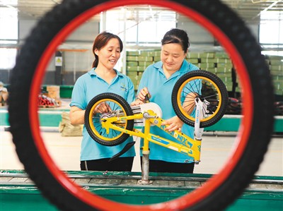 河北省邱县鼓励当地劳动密集型企业在农村建立“扶贫驿站”,帮助农村贫困群众在家门口就业。图为工人在邱县一家自行车生产企业在该县聂楼村设立的“扶贫驿站”内组装自行车(2017年7月16日摄)。