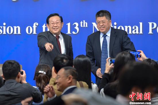 十三届全国人大一次会议新闻中心于3月10日15时举行记者会,国务院国资委主任肖亚庆,副秘书长、新闻发言人彭华岗就“国有企业改革发展”相关问题回答记者提问。中新社记者 李卿 摄