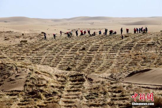 3月7日,甘肃临泽县民众在该县北部荒漠区压设麦草沙障,开展“治沙播绿、改善生态”的防沙治沙“接力赛”。多年来,该县通过生物治沙、工程治沙相结合的方式,持续防沙治沙,筑牢生态安全屏障。张渊摄
