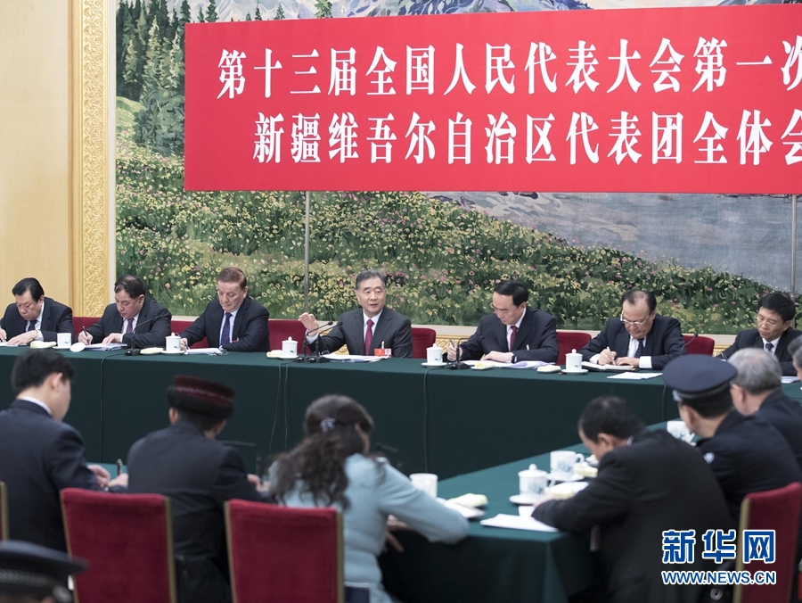 3月12日,中共中央政治局常委、国务院副总理汪洋参加十三届全国人大一次会议新疆代表团的审议。 新华社记者 王晔 摄