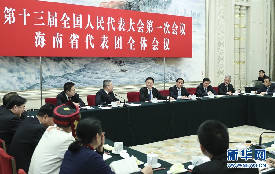 韩正在海南代表团参加审议。在认真听取刘赐贵、沈晓明、陈飘等代表发言后,韩正说,完全赞同全国人大常委会工作报告。报告围绕中心、突出重点、客观实在,通篇贯穿了习近平新时代中国特色社会主义思想,体现了坚持党的领导、人民当家作主、依法治国的有机统一。韩正说,海南在国家发展全局中地位作用更显重要,要以习近平新时代中国特色社会主义思想为指导,落实党中央决策部署和习近平总书记对海南发展的重要指示精神,以庆祝改革开放40周年和海南建省办经济特区30周年为契机,以国际旅游岛建设为总抓手,把保护生态环境放在优先位置,加快建设经济繁荣、社会文明、生态宜居、人民幸福的美好新海南。